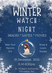 Winter Watch Night – is an annual youth event. Join us for snacks, movies and games! Invite your friends & bring a comfy blanket.